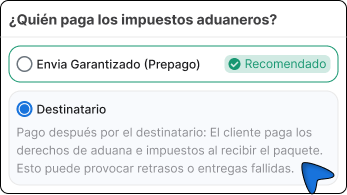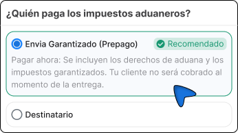 - Si la opción aparece durante el checkout, signifca que el carrier y la ruta soporta aranceles e impuestos prepagados y garantizados.