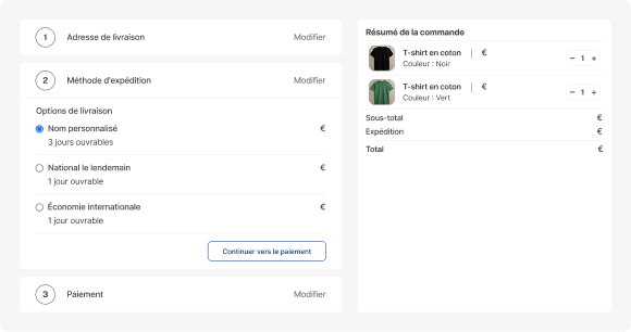 Intégrer votre boutique avec envia.com vous donne accès au section paiement de votre boutique (checkout), un outil qui affiche les coûts d'expédition en temps réel. Cela facilite le processus d'achat, permettant à vos clients de connaître le coût exact et les dates estimées de livraison avant de finaliser leur commande. De plus, vous pouvez sélectionner jusqu'à trois services de messagerie par pays pour offrir les meilleures tarifs.
