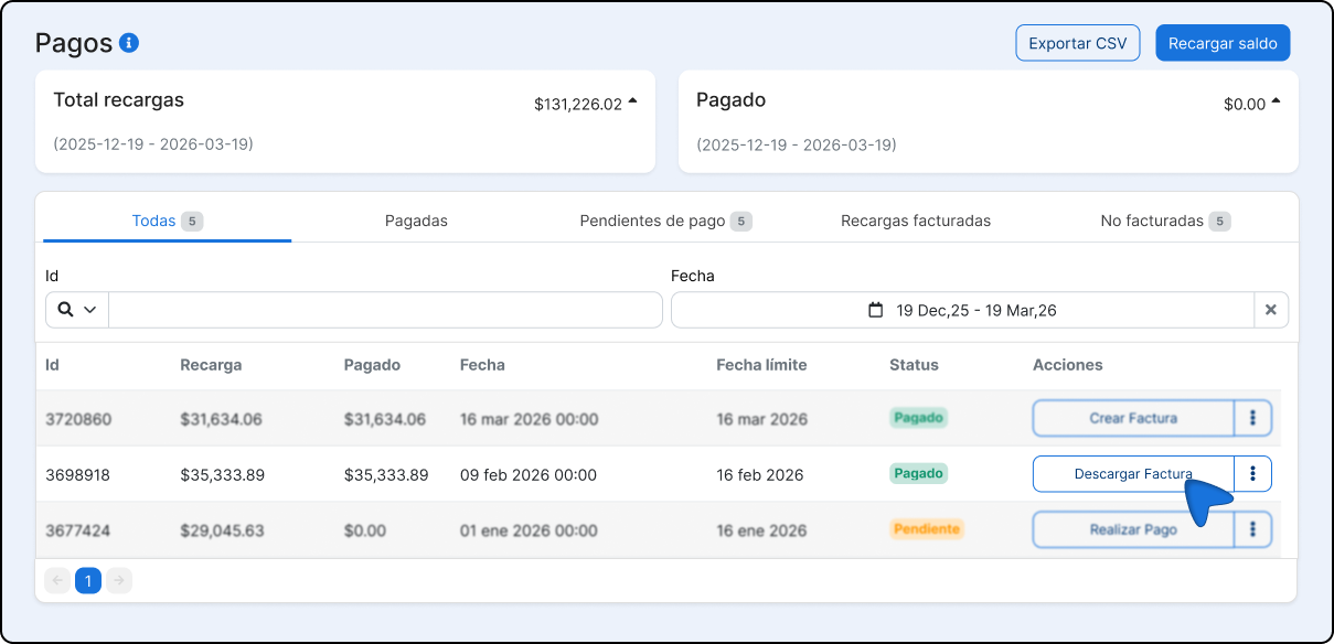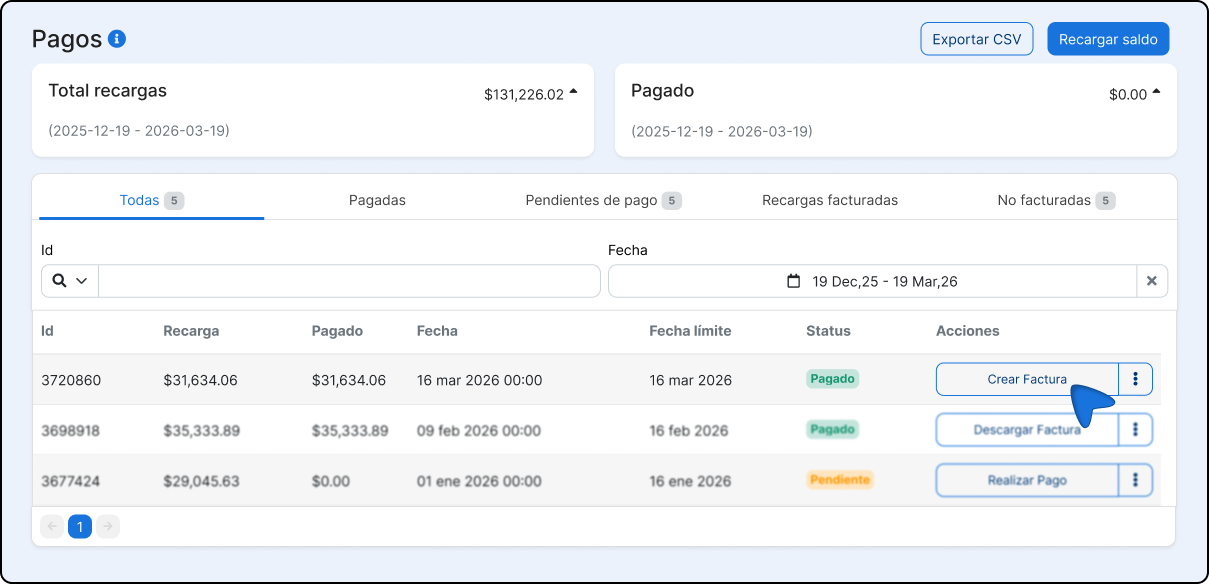 Vous pouvez configurer la plateforme pour qu'elle génère automatiquement une facture. chaque fois que vous rechargez votre solde créditeur, sans devoir le faire manuellement.