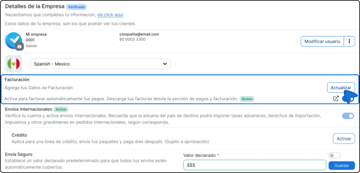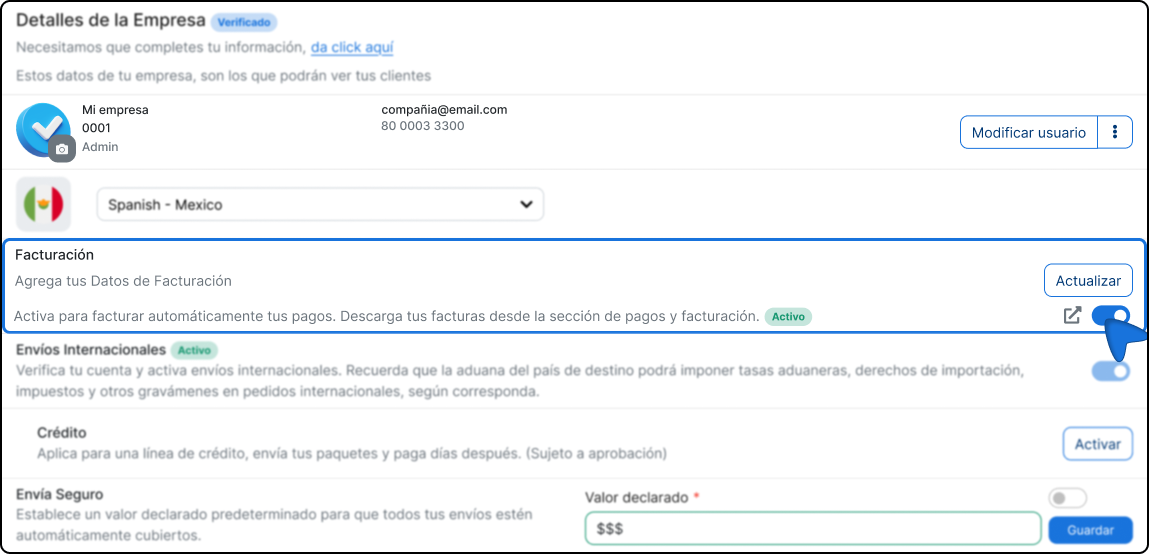 Vous pouvez enregistrer plus d'un profil de facturation sur votre compte. Dans ce cas, il est recommandé de désactiver la facturation automatique de pouvoir choisir manuellement avec quelles informations chaque facture sera émise. Si la facturation automatique est active, le système utilisera les données configurées en tant que prédéterminé.