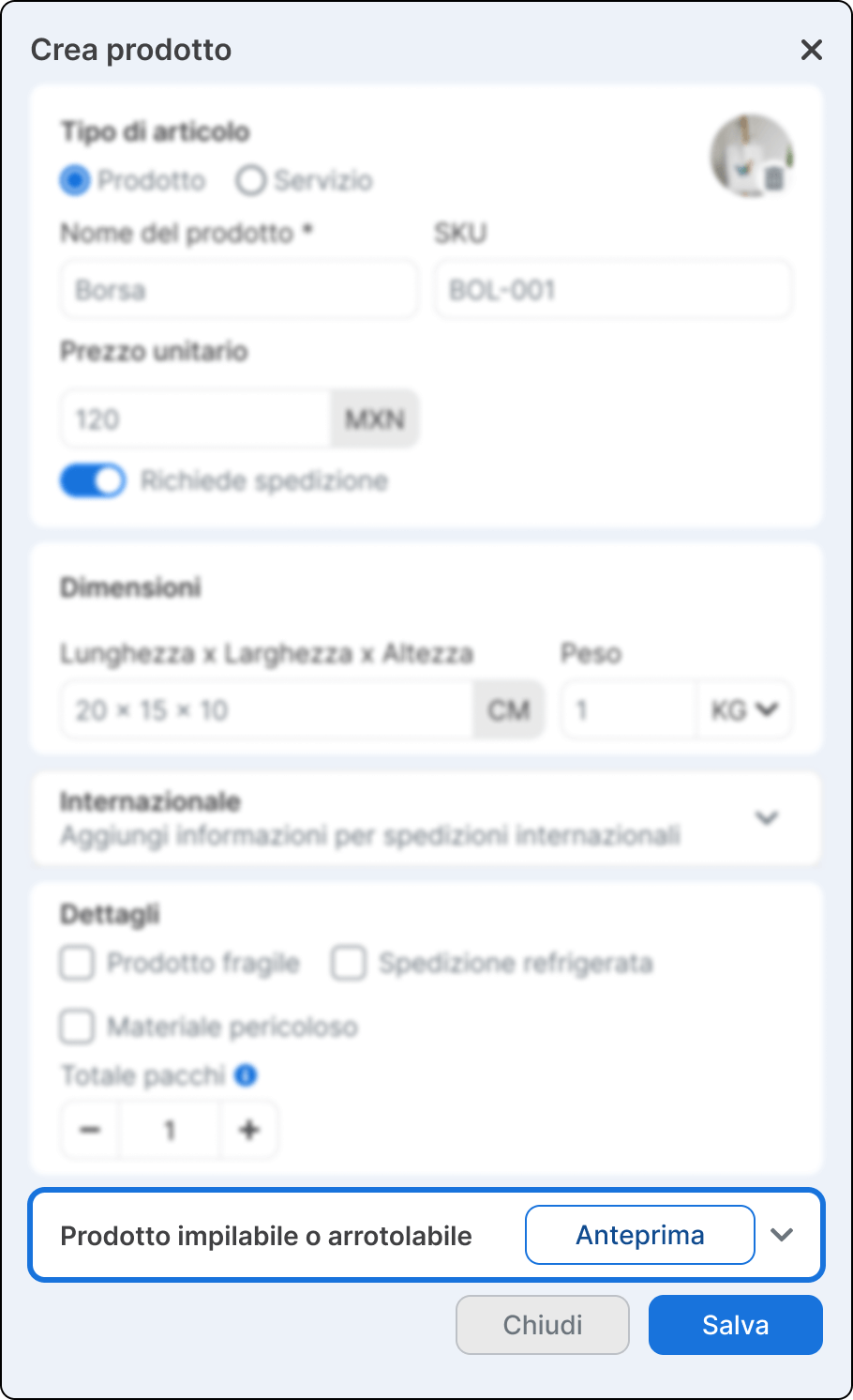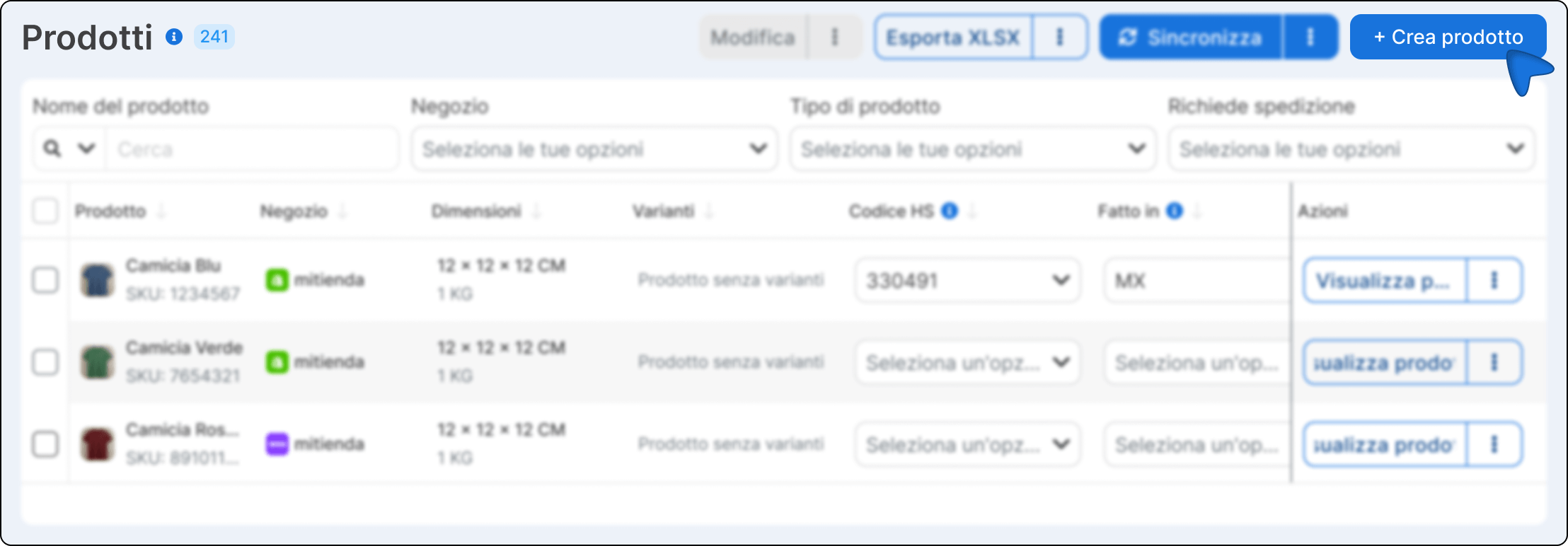 Aggiungere i tuoi prodotti ti consente di registrare le informazioni necessarie per creare spedizioni in modo più rapido e preciso. Avendo i prodotti già creati, potrai riutilizzarli durante la generazione di spedizioni nazionali o internazionali, evitando di inserire le stesse informazioni in ogni operazione.