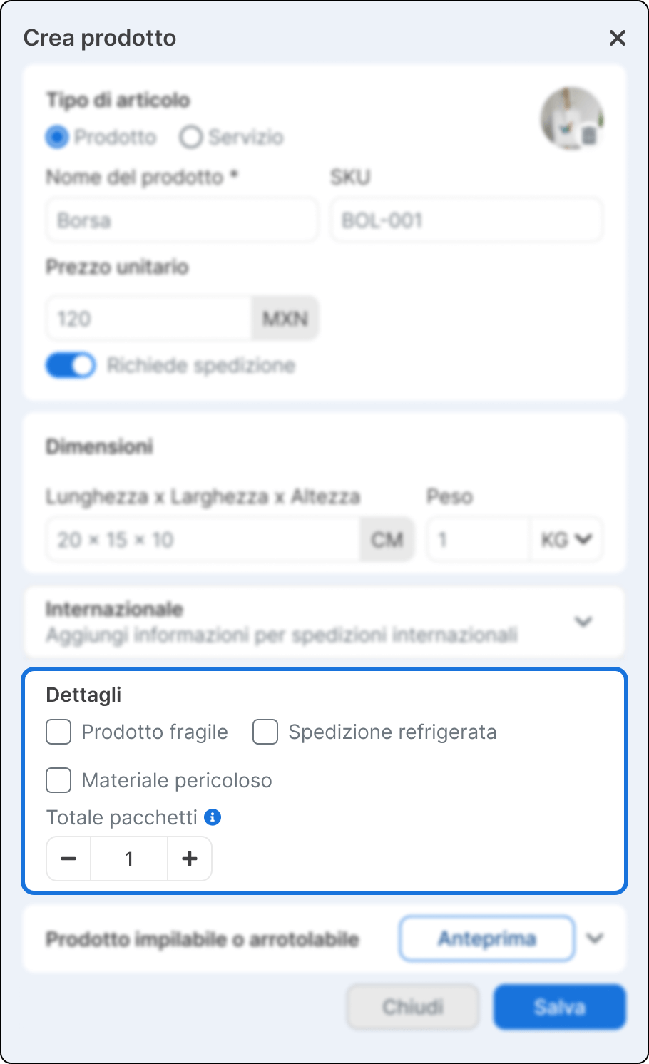 - Nome del prodotto. Nome con cui identificherai il prodotto durante la creazione delle spedizioni.