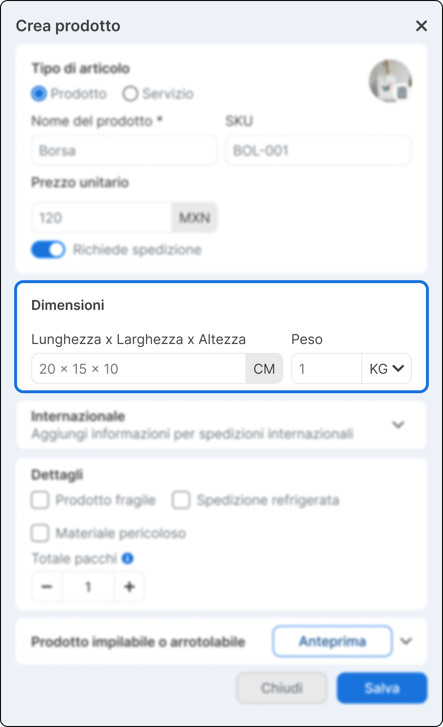 - Dimensioni. Inserisci unghezza × larghezza × altezza del prodotto.