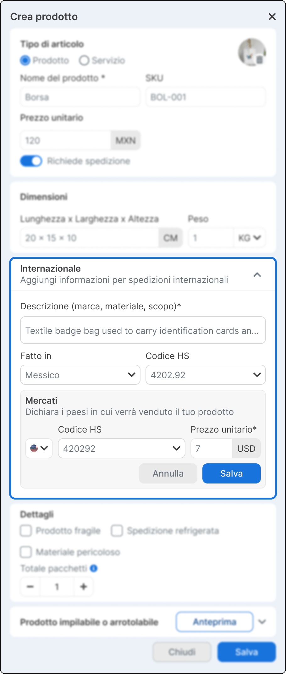 - Codice HS. Scegli un codice HS per classificare il prodotto in dogana. Il sistema può suggerire automaticamente i codici in base alla descrizione.