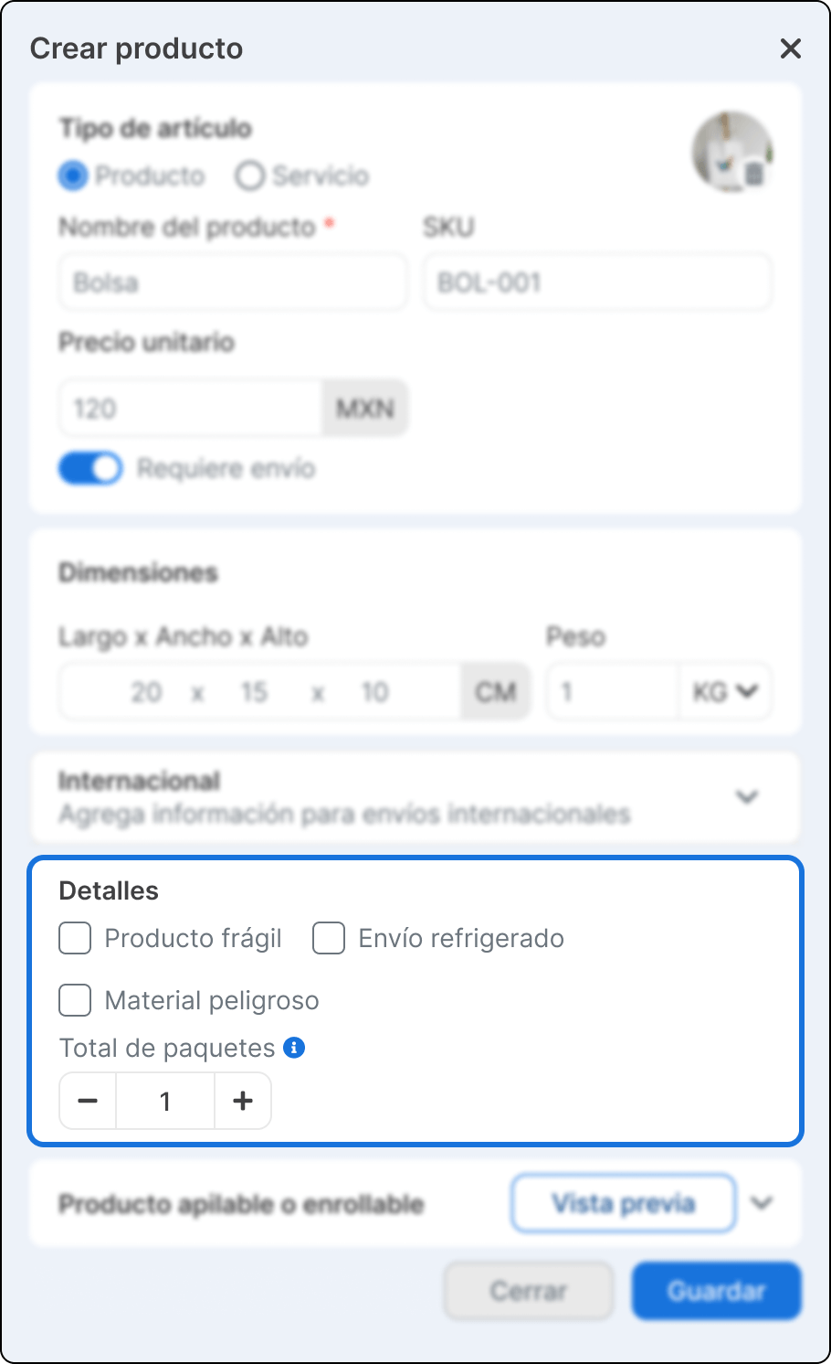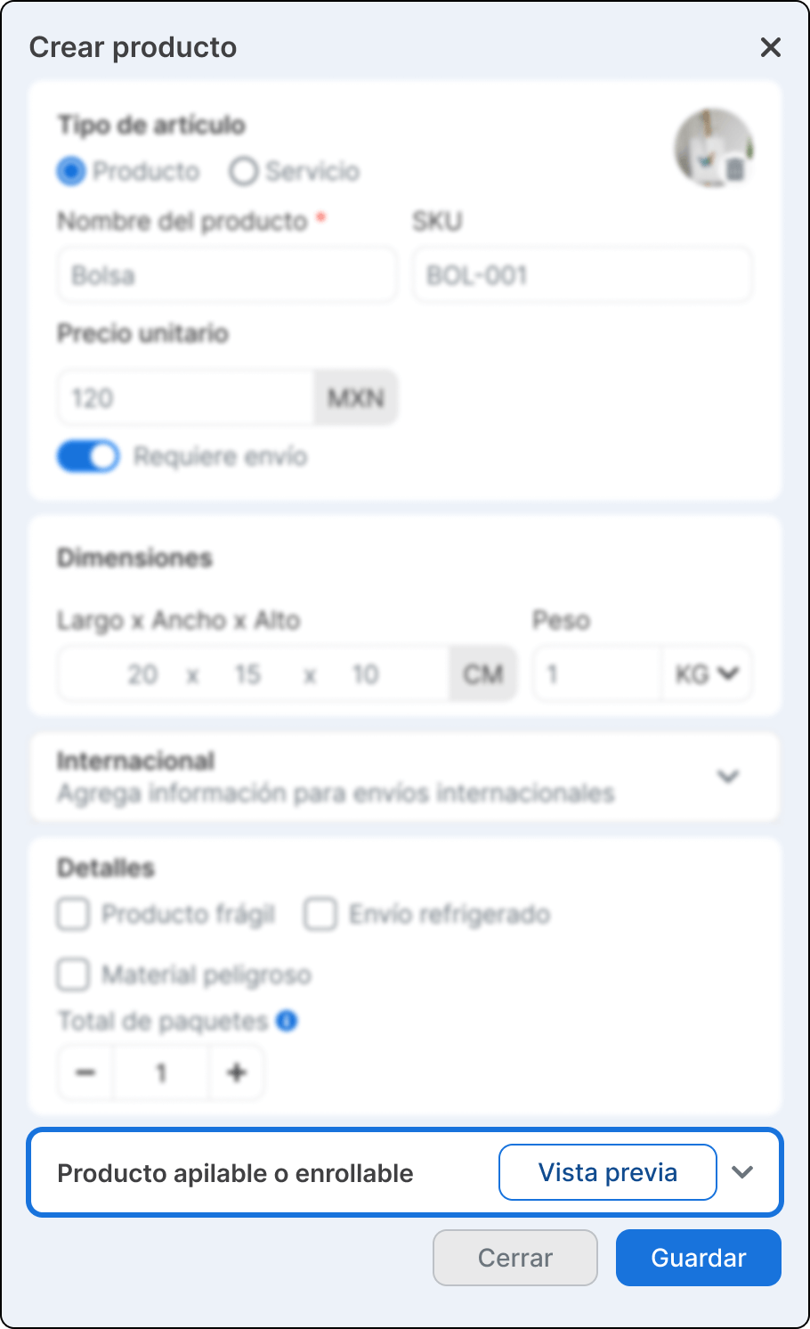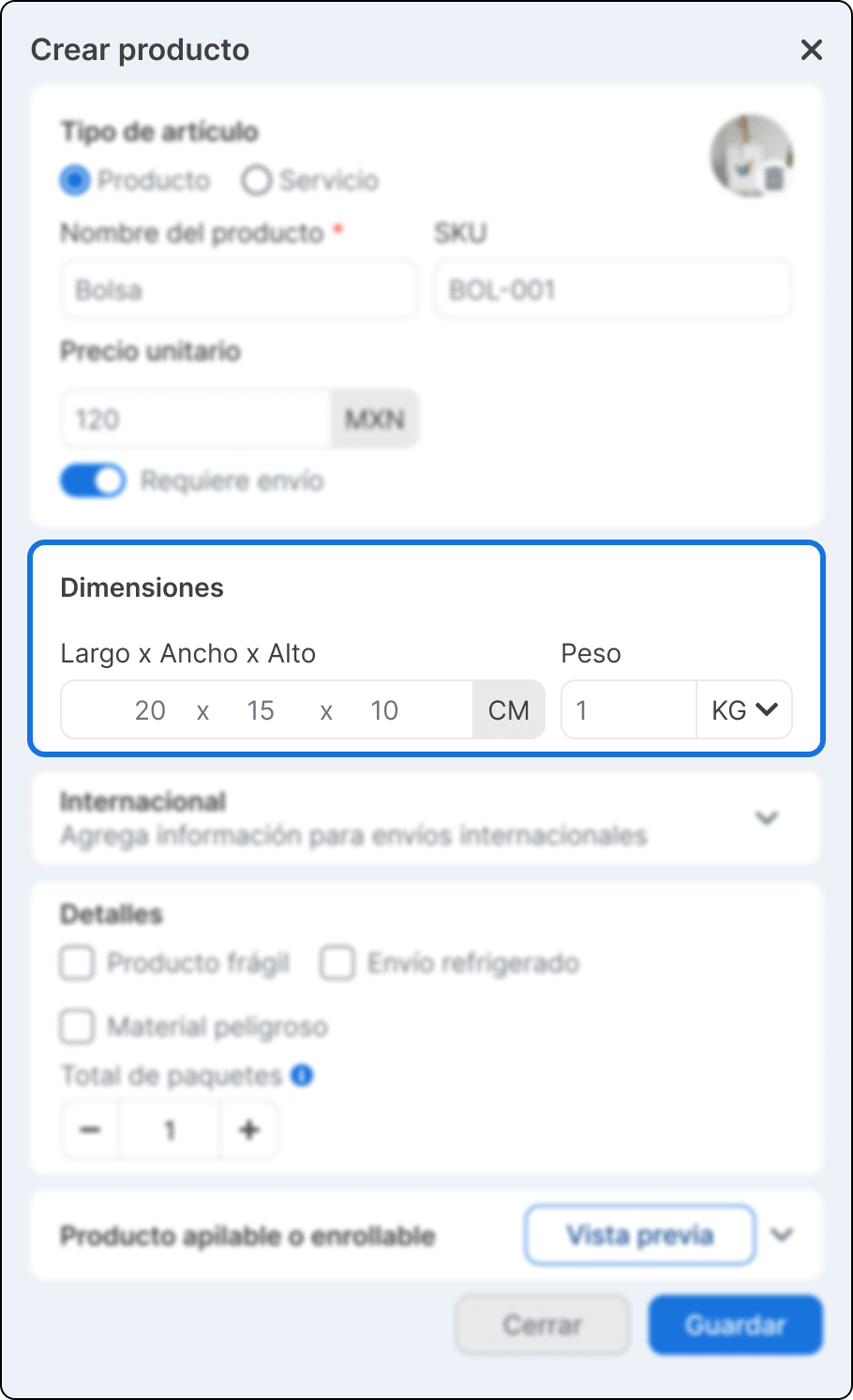 Desde este flujo puedes agregar productos con o sin e-commerce vinculado y definir desde el inicio datos clave como dimensiones, peso y configuraciones para envíos internacionales.