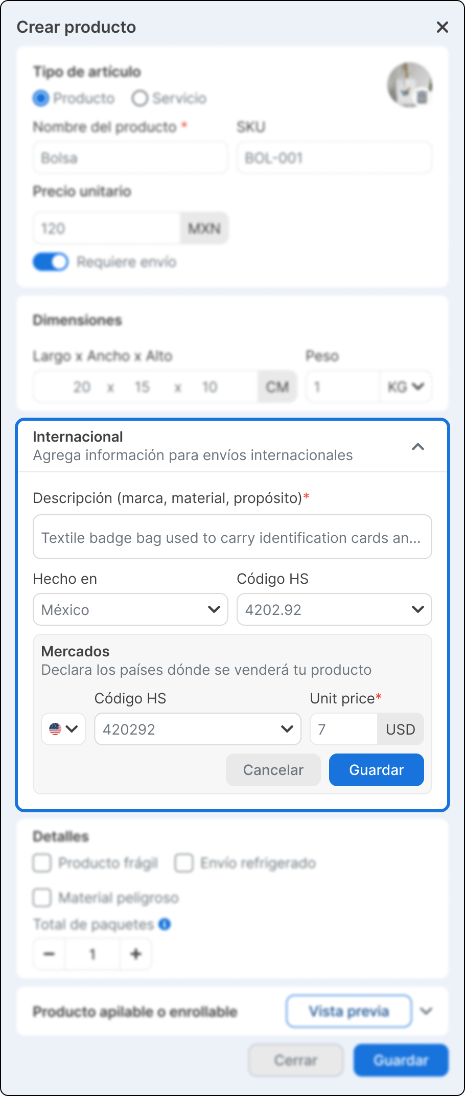 - Código HS. Elige un código HS para clasificar tu producto en aduanas. El sistema puede sugerir códigos automáticamente según la descripción.
