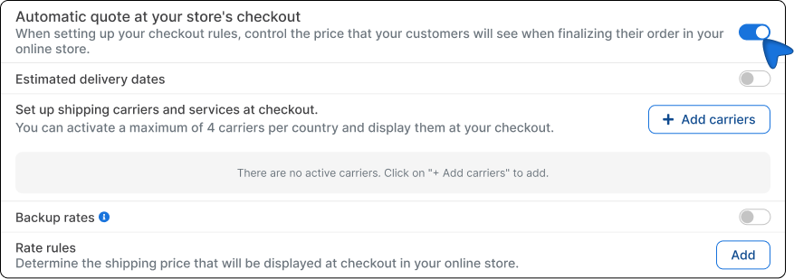 3. A Tariffe al checkout in tempo reale activa el interruptor para habilitar el cotizador automático.
