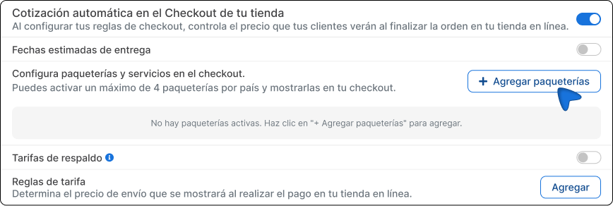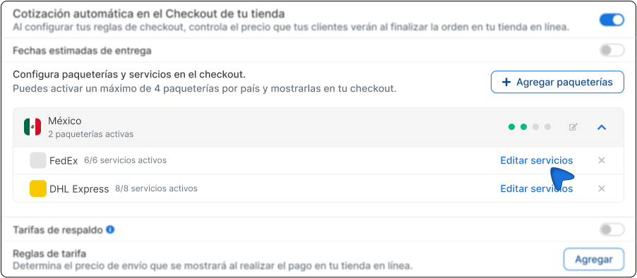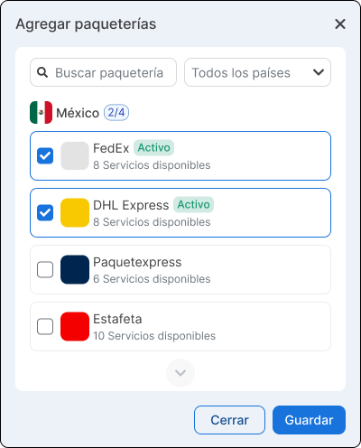 4. Haz clic en el botón Agregar paqueterías y selecciona hasta cuatro servicios de paquetería por país, según tu preferencia.