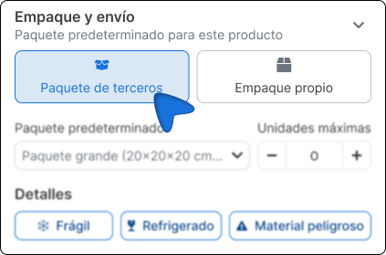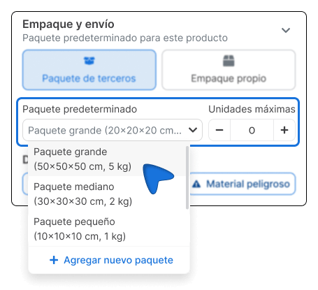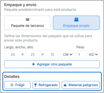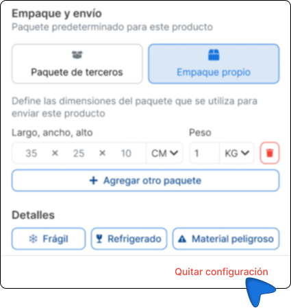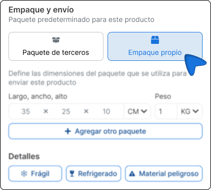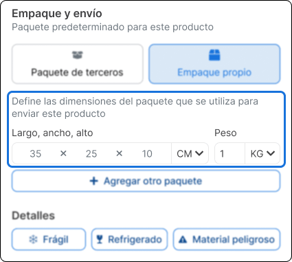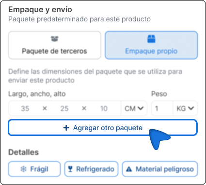 8. (Facoltativo) Se il prodotto può essere presentato in più di un formato di casella, selezionare + Aggiungere un altro pacchetto per registrare ulteriori dimensioni.