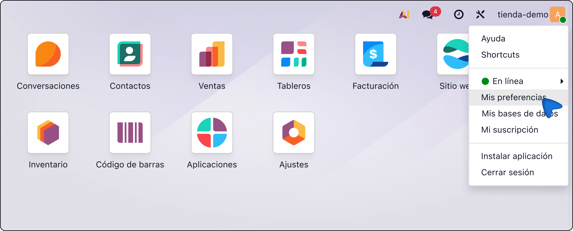 10. Tornare alla scheda Odoo. Aprire il menu utente e selezionare Le mie preferenze.