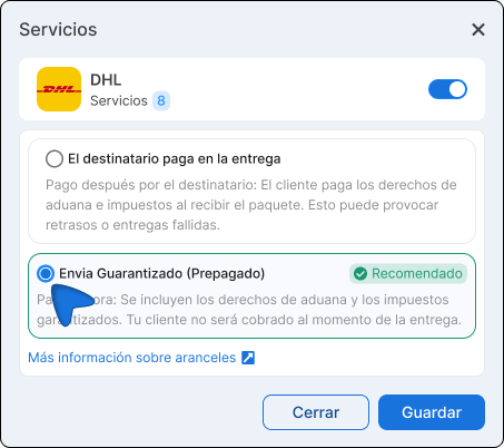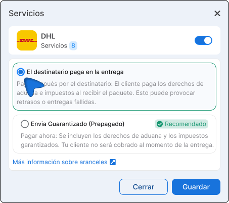ℹ️ Se si desidera che il cliente conosca il costo totale prima dell'acquisto, l'opzione Spedizione prepagata DHL (prepagata) è la migliore alternativa. Per ora è disponibile solo con DHL.