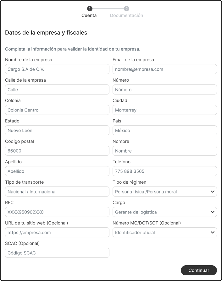 - Número MC/DOT/SCT (opcional)