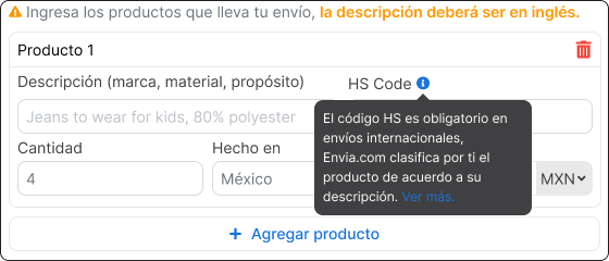 ℹ️ Envia.com analiza la descripción en inglés que ingresas y te sugiere automáticamente un código HS compatible.