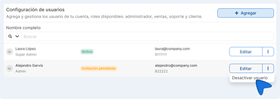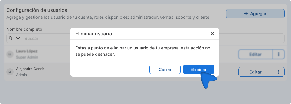 Sim, na seção Usuários, Os superadministradores podem remover usuários de sua empresa a qualquer momento.
