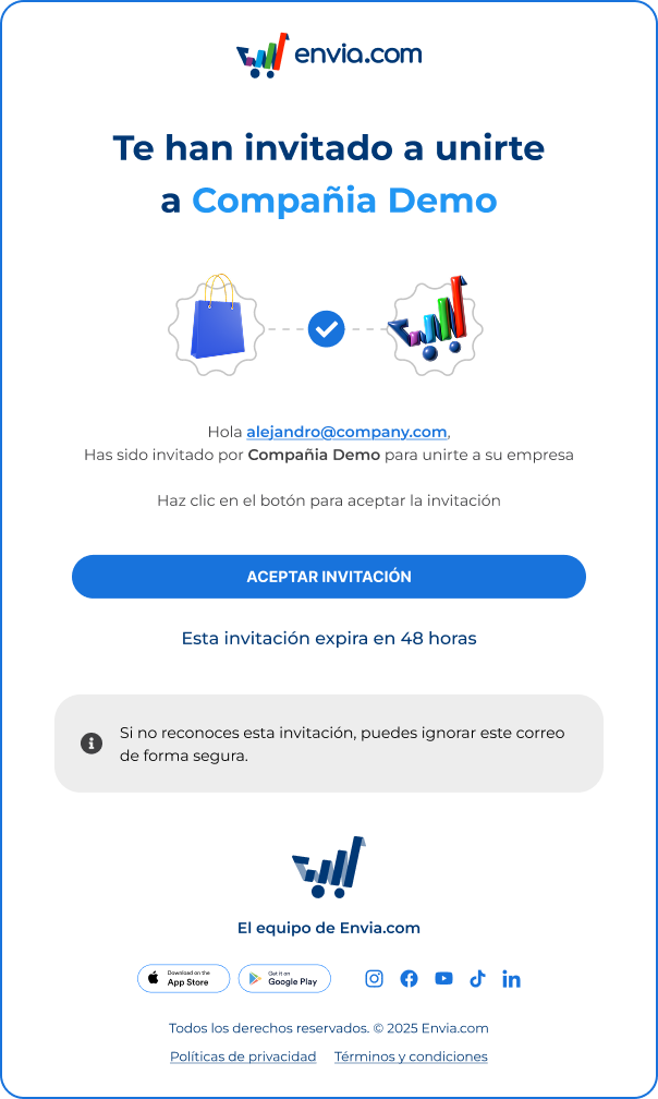Se o usuário convidado ainda não tiver uma conta no Envia.com, ele receberá um link para criar uma conta e entrar na sua empresa ao mesmo tempo.
